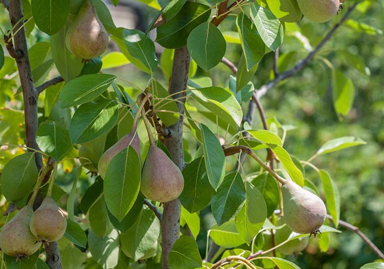 Die Früchte des Birnbaums sind grüngelb oder bräunlich und variieren in Form und Reifezeit. Je nach Sorte sind sie zwischen Juli und Oktober reif. Das Fruchtfleisch ist weicher und süßer als beim Apfel. Die meisten Birnensorten sollten direkt nach der Ernte verzehrt oder weiterverarbeitet werden. Einige Herbst- und Wintersorten müssen dagegen eine längere Zeit gelagert werden, bis sie weich sind und ihr Aroma entfaltet haben.