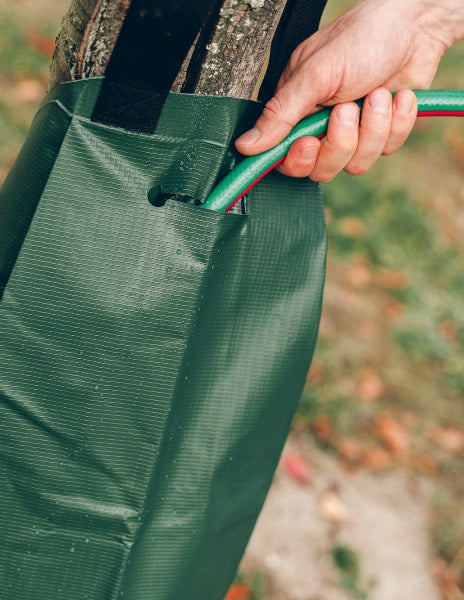Unsere Bewässerungssäcke sind so konzipiert, dass das Wasser langsam über zwei Öffnungen an den unteren Seiten (links und rechts) austritt. Wenn sich diese Öffnungen beim Befüllen und Aufschütteln nicht korrekt ausrichten, kann es vorkommen, dass das Wasser schneller abläuft als gewünscht.