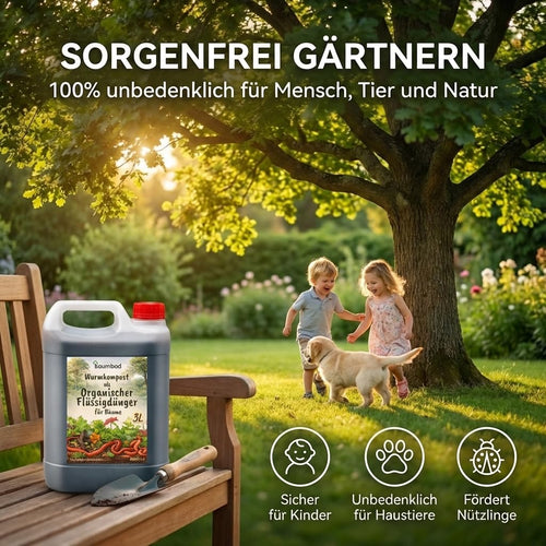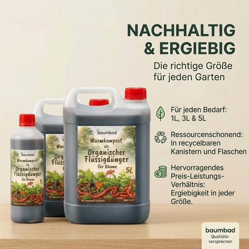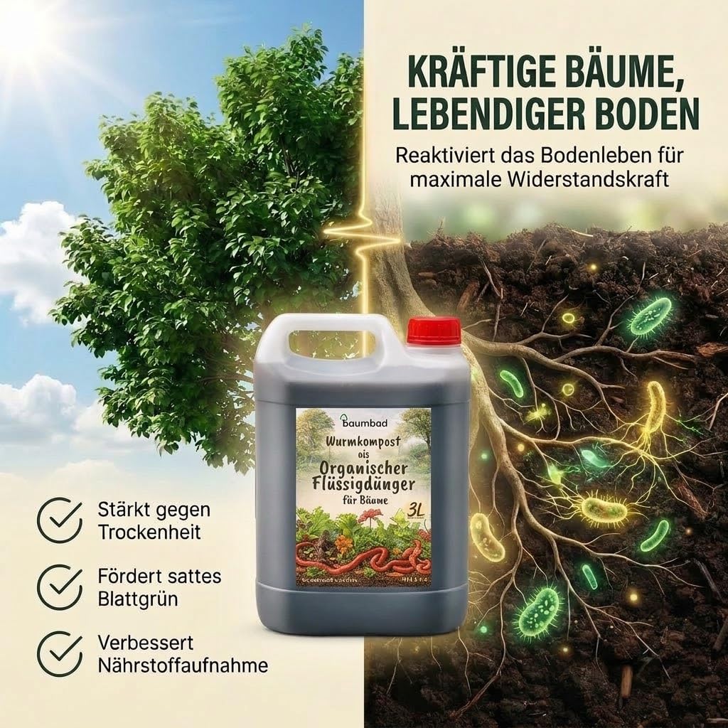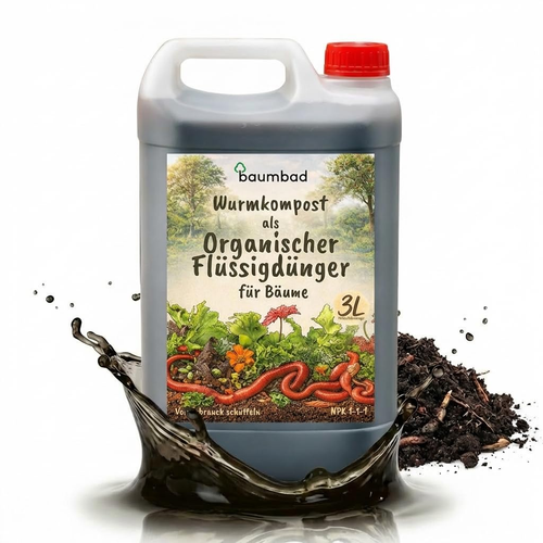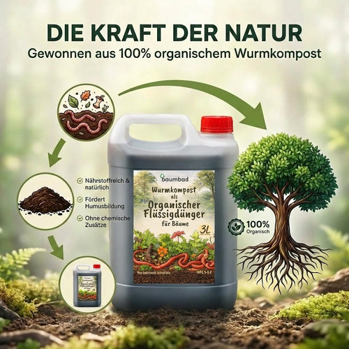 Unser baumbad Flüssigdünger basiert auf hochwertigem Wurmkompost / Vermicompost – dem natürlichen Endprodukt von Regenwürmern. Er enthält eine Fülle an lebenden Mikroorganismen, Huminsäuren, pflanzenverfügbaren Nährstoffen und wachstumsfördernden Enzymen.